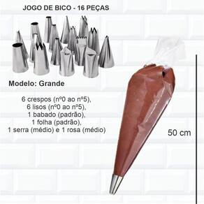 -jogo de bico inox 16 peças: 6 crespos nº0 ao nº5 , 6 lisos nº0 ao nº5 , 1 babado padrão , 1 folha padrão , 1 serra médio e 1 rosa médio