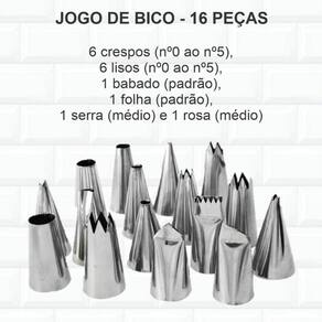 - jogo de bico para confeitar - 16 peças: 6 crespos nº0 ao nº5 , 6 lisos nº0 ao nº5 , 1 babado padrão , 1 folha padrão , 1 serra médio e 1 rosa médio