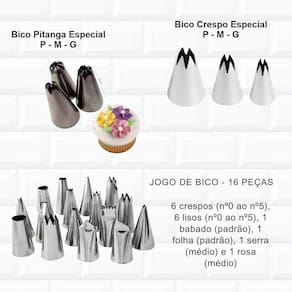 Kit confeiteiro especial para aqueles que estão iniciando no ramo da confeitaria ou para quem quer renovar seus utensílios. Conteúdo: - bailarina giratória - polipropileno - 30 cm branca - kit formas redonda 3 peças 15, 20 e 25 cm - jogo de bico inox 16 pç: 6 crespos nº0 ao nº5 , 6 lisos nº0 ao nº5 , 1 babado padrão , 1 folha padrão , 1 serra médio e 1 rosa médio - manga descartável 6 unid. - kit bico 1m 3 peças p m g - kit bico 1b 3 peças p m g Não encontrou o que procura Nos envie uma mensagem com sua sugestão faremos o possível para encontrar e publicar o que deseja com um valor competitivo, assim você poderá colocar todos os produtos no carrinho e enviaremos tudo em um único . A isamar é uma empresa voltada ao segmento de panificação e confeitaria. Atuamos no mercado desde 1978, criando parcerias e impulsionando negócios. Desenvolvemos produtos de alta qualidade para que possamos atender bem cada cliente, o que faz de cada um, parceiros e amigos. Atuamos em todo o território nacional oferecendo soluções completas para o setor. Obrigado pela visita e boas compras Marca: Não Informado Ean: 7894369001425