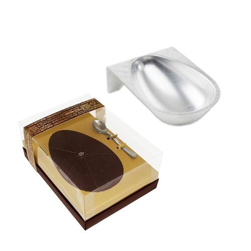 Forma em alumínio liso, de tamanho grande. Vai ao forno e freezer. Com apoio para que a moldura seja perfeita sem elevações na hora do preparo. Compatível com formas ovo de páscoa de 500g.
