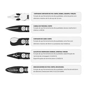 O Kit de Alicate 5 em 1 oferece uma solução versátil e eficiente para uma variedade de tarefas elétricas. Com suas 5 mandíbulas intercambiáveis, este conjunto se destaca pela sua adaptabilidade. O cortador tradicional proporciona precisão ao realizar cortes, enquanto o cortador de cabos abrange uma ampla faixa, de fios finos até 16mm de espessura. O descascador de cabos, com sua faixa de 0.6 a 2.6 mm, oferece uma maneira fácil e eficaz de remover a cobertura dos fios. O crimpador, com capacidade para 1.5-6 / 22-10 AWG, é ideal para fixação segura de terminais. Feito de aço inox durável, o alicate apresenta um cabo emborrachado para aderência confortável durante o uso. Informações Técnicas: 5 mandíbulas Intercambiáveis Cortador tradicional Cortador de cabos até 1.6mm Cortador de cabos até 16mm Descascador de cabos 0.6 até 2.6 mm Crimpador 1.5 - 6 / 22-10 Acompanha estojo para transporte Material: aço inox e cabo emborrachado Itens Inclusos: 1x Kit Alicate Universal 5 em 1 5x Mandíbulas 1x Estojo de transporte