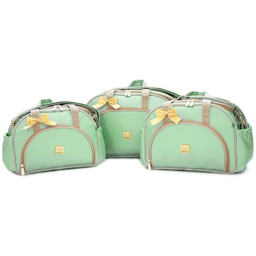 Kit conjunto bolsas maternidade bebe menina menino enxoval miellu - linha prática - bolsa g, bolsa m, bolsa p e trocador Cor: menta Kit bolsas maternidade miellu - linha prática Kit maternidade desenvolvido pela miellu com a finalidade de proporcionar praticidade, conforto, qualidade, estilo e durabilidade = exterior - fabricada em material sintético antialérgico externamente, material resistente, que não descasca e de fácil limpeza. - alças reforçadas com fita cadarço - alça tira-colo ombro com mosquetão fecho dourado de um dos lados, que possibilita retirada e acomodação no bolso lateral para evitar perdê-la. - bolso frontal - bolso lateral dos dois lados da peça para facilitar o dia-a-dia - ampla abertura do compartimento principal proporcionado pela tampa central com dois cursores, o que facilita a organização e manuseios dos itens na bolsa. - ferragens em dourado - laço de cetim na alça. = interior - internamente forrada em bagum e nylon branco, garantindo higiene, facilidade de limpeza e durabilidade, sem agregar peso a bolsa. - porta mamadeira térmico embutido, mais praticidade e proteção para a mamadeira apenas na bolsa g e na bolsa m - porta objetos no interior para facilitar a organização - bolso interno na tampa da abertura principal para cartões, chaves ou documentos Dimensões - 1 bolsa grande - 41cm largura x 27cm altura x 20cm profundidade - 1 bolsa média - 36cm largura x 25cm altura x 17cm profundidade - 1 bolsa pequena 34cm largura x 23cm altura x 16cm profundidade - 1 trocador 68x39 = as bolsas grande e média são equipadas com porta mamadeira térmico embutido, a bolsa pequena não possui = Produto nacional, feito por brasileiros.