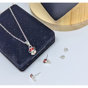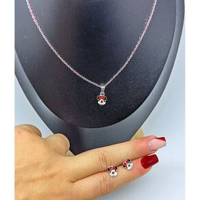Kit Conjunto Colar e Brincos Antialérgico Infantil Meninas com Pingente Minnie ou Mickey Disney Kids Folheado a Prata - Cor: Minnie