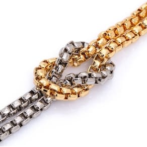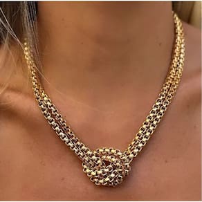 É uma escolha de alta qualidade que é sempre atual. O destaque deste colar é o detalhe em nó direito. O nó direito é um símbolo de união, laços fortes e conexões duradouras. Ele representa a ligação entre duas partes, seja entre amigos, familiares ou amantes. Este colar é uma maneira subtil e sofisticada de mostrar o apreço por relações significativas em sua vida. Este colar é uma declaração de estilo e conexão.