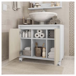 O Gabinete Armario Clean se adapta a sua necessidade, seu design permite que o gabinete fique posicionado abaixo do lavatorio entre a coluna. O Armario possui 6 divisorias com 3 prateiras permitindo guardar objetos, e 1 espelho com prateleira. Feito em MDP FF 15MM garantindo mais durabilidade e resistencia ao produto.