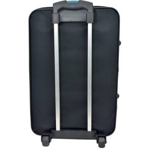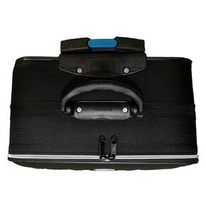 Pode ser utilizada como bagagem de mão em aviões Logo frontal Estrutura revestida com poliéster Alça de mão superior e lateral Carrinho com estágios para regulagem de altura Carrinho de alumínio Fechamento com zíper em nylon