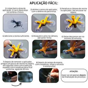 1 x Resina de reparo - tubinho com 3ml; 1 x Dispositivo de reparação de automóveis; 5 x Filme de finalização; 1 x Lâmina de acabamento; 1 x Manual de instrução.
