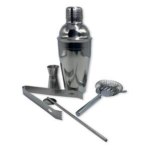 Coqueteleira 22cm altura x 7cm diâmetro Separador 18cm comprimento x 7cm largura Mini copo dosador 7cm altura x 3,5cm diâmetro Misturador 19cm comprimento Pinça 16cm comprimento