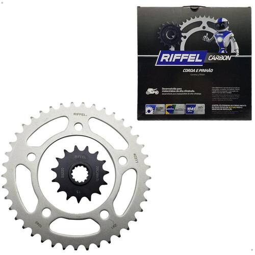 Kit Coroa Pinhão Riffel CB 500 F CB 500 X CB 500 R CBR 500 Produto: Kit Riffel Carbon. Descrição e aplicação: Coroa: 41 dentes, passe 520, fabricação em aço carbono 1045.Pinhão: 15 dentes, passe 520, fabricação em aço 20CrMnTi.Corrente: Não inclusa no kit. Este kit de relação é compatível com os seguintes modelos de motocicletas: CB 500 F ano 2014 até 2016CB 500 X ano 2014 até 2016CB 500 R ano 2014 até 2016CBR 500 ano 2013 até 2017 Peça nova marca Riffel. Conteúdo da embalagem: 01 Coroa01 Pinhão Observação: O produto pode ter alguma variação quando comparado com a imagem. Dimensões da embalagem: Altura: 10cm / Largura: 30cm / Profundidade: 30cm / Peso: 2,3Kg Sobre a empresa: A SF Motos iniciou suas atividades em janeiro de 2007 como concessionária da marca Kasinski, destacando-se como um dos principais revendedores no Brasil. Após a saída da Kasinski do mercado brasileiro em 2013, a empresa se reinventou como importadora e revendedora de peças de motocicletas multimarcas. Seu principal objetivo é atender os clientes que ficaram desassistidos de peças devido à saída de alguns fabricantes do mercado nacional, com foco principal nas vendas online. ML 07/23