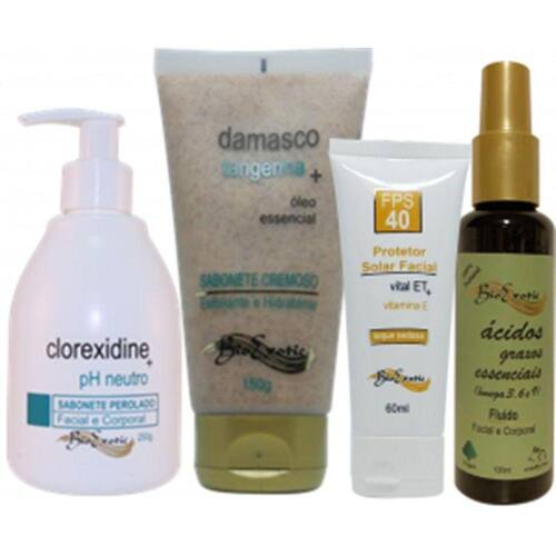 Kit Corporal para Prevenção de Estrias na Gravidez Bioexotic 1 Sabonete neutro de Clorexidine 250 ml2 Sabonete esfoliante Damasco e Tangerina 150 g3 Fluido AGE - Ácidos Graxos Essenciais + Vitamina F 120 ml4 BB Cream FPS 40 Vital ET + Vitamina E 60gMODO DE USAR:1 Higienizar a Pele com Sabonete Neutro de Clorexidine, retirar com Água e secar.2 Esfoliar, com o Sabonete Esfoliante em dias alternados para retirar as células mortas e permitir maior absorção do produto.3 Aplicar o Fluído AGE, massageando com as mãos na Barriga, Seios e demais regiões propensas a Estrias. deixar a Pele absorver totalmente.4 Aplicar BB Cream FPS 40 nas regiões expostas.Propriedades do fluído AGE:Emoliente, Cicatrizante, Nutritivo, preventivo de Escaras de Decubito, Estrias e Assaduras.Aplicar duas vezes por semana ou a critério do profissional.