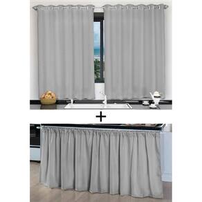Kit Cortina de Cozinha e Pia Balcão Tecido Liso Cinza