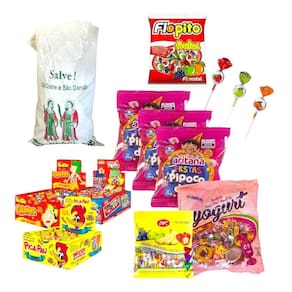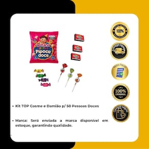 1 pacote de pipoca contendo 50 unidades 2 pacotes de chiclete contendo 100 unidades 2 pacotes de bala contendo 100 unidades 4 pacotes de pirulito contendo 50 unidades 1 pacote de saquinho de plástico 18x28cm Cosme e Damião para montar contendo 50 unidades