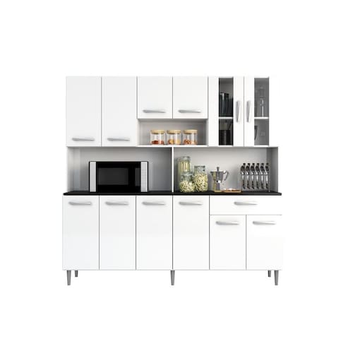 O Kit Cozinha 12 portas 1 gaveta Antonela da FdECOR Móveis é um produto amplo e versátil podendo ser utilizado como complemento de cozinha ou peça única, são 12 portas sendo duas com detalhe em vidro proporcionando charme a peça, 01 gaveta com corrediças metálicas, nicho organizador decorativo, espaço para dispor aparelhos e utensílios domésticos, puxadores em polímero e pés PVC 13cm fixos que garantem firmeza ao produto. Produto em MDP Perffect Touch de maior resistência e com proteção Bacterban que inibe a proliferação de fungos e bactérias na superfície do móvel e portas em MDP com pintura UV brilho. Produto ecologicamente correto com embalagens preparadas para evitar danos e permitir que o produto chegue em perfeito estado em sua casa. Perfeita combinação com os mais variados ambientes. Qualidade que só a FdECOR oferece em seus produtos.