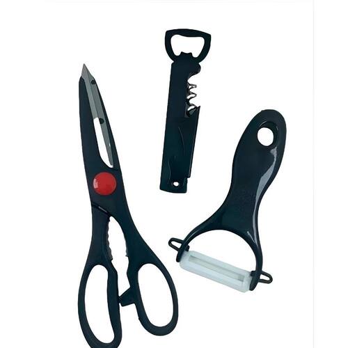 Especificações técnicas: - Material: Aço Inox e ABS - Cor: Preto - Dimensões da tesoura: 21cm x 7cm - Dimensões do descascador: 12,5cm x 8cm - Dimensões do abridor: 12cm x 3cm Marca: Não Informado Ean: 7891841836018