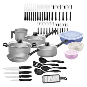 Kit Cozinha 47pçs Panelas Talheres Facas Utensílios Kit Tramontina 47 peças para Cozinha com Panelas Antiaderentes em Alumínio, Talheres, Facas e Utensílios Domésticos Tenha tudo o que você precisa para cozinhar com eficiência e praticidade com o kit Tramontina 47 peças para cozinha com panelas antiaderentes em alumínio, talheres, facas e utensílios domésticos. As panelas são feitas em alumínio com revestimento interno e externo em antiaderente, proporcionando cozimento rápido, uniforme e sem grudar. As alças e cabos em baquelite e os pegadores em nylon garantem um manuseio e confortável. As tampas de vidro temperado com borda de aço inox permitem acompanhar o preparo sem abrir as panelas. O kit inclui também utensílios de nylon, potes, facas e talheres com lâminas de aço inox e cabos de polipropileno resistentes e fáceis de limpar. Completo e funcional, é a escolha certa para quem busca praticidade e qualidade na cozinha!