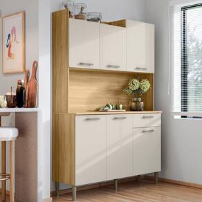 O Armário Kit Cozinha é perfeito para quem busca pde e estilo na organização do ambiente. Produzido em MDP de 12mm e 15mm, conta com 06 portas e 01 gaveta, equas com dobradiças e corrediças metálicas. O design conta com puxadores ergonômicos e pés fixos, ambos em plástico resistente, além de nichos decorativos e prateleiras internas. Com pintura UV (fosco ou semibrilho), o acabamento do móvel oferece maior proteção, realce nas cores e facilidade na limpeza do dia a dia. Este móvel chegará em sua casa separado em 02 volumes.
