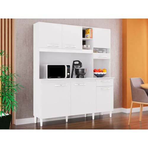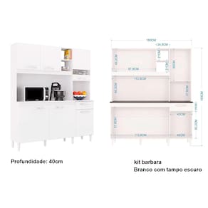 Kit para Cozinha Barbara Branco - Poquema Chegou a hora de inovar sua cozinha e você procura por armários de qualidade e com preços baixos? Aqui você encontra. Apresentamos o Kit para Cozinha da linha Barbara desenvolvida pela Poquema pensando em você que não tem muito espaço, mas não abre mão da organização e modernidade, conta com lindo design e um amplo espaço interno com repartições para melhor organizar seus utensílios, fabricado com materiais de ótima qualidade, proporcionando maior durabilidade ao móvel. Confira abaixo as características técnicas e garanta já o seu! Características Técnicas:- Desenvolvido 100% em MDP- Acabamento em pintura U.V na cor Branco- Possui 06 Portas sendo 01 com detalhe em vidro 3mm- Dobradiças metálicas- 01 Gaveta- Corrediças metálicas- Puxadores cromados- Divisões- kit pés plástico Branco- Acompanha tampo- Amplo espaço- Lindo design Dimensões:Altura: 1,83 cmLargura: 1,60 cmProfundidade: 40 cm Informações importantes:*Não realizamos a montagem ou instalação do produto, porém acompanha manual de instruções.
