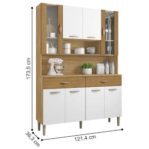 Produzido em MDP de 12mm e 15 mm, com oito portas - sendo duas portas superiores com vidro, dobradiças e corrediças 100% metálicas, duas amplas gavetas, puxadores ergonômicos em plástico resistente (poliestireno), pés fixo em plástico resistente (polipropileno).