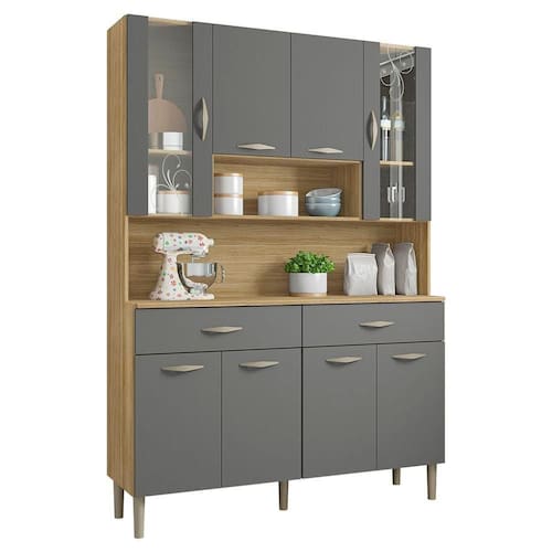 O Armário Kit Cozinha é perfeito para quem busca pde e estilo na organização do ambiente. Produzido em MDP de 12mm e 15mm, conta com 08 portas, sendo 02 portas superiores com vidro temperado, e 02 gavetas, equas com dobradiças e corrediças metálicas. O design conta com puxadores ergonômicos e pés fixos, ambos em plástico resistente (poliestireno e polipropileno), além de nichos decorativos. Com pintura UV, o acabamento do móvel oferece maior proteção, realce nas cores e facilidade na limpeza do dia a dia. Este móvel chegará em sua casa separado em 01 volume.
