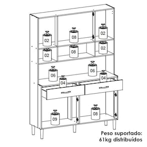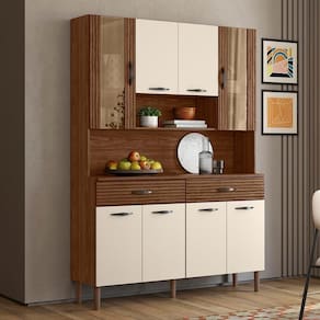 O Armário Kit Cozinha é perfeito para quem busca pde e estilo na organização do ambiente. Produzido em MDP de 12mm e 15mm, conta com 08 portas, sendo 02 portas superiores com vidro temperado, e 02 gavetas, equas com dobradiças e corrediças metálicas. O design conta com puxadores ergonômicos e pés fixos, ambos em plástico resistente (poliestireno e polipropileno), além de nichos decorativos. Com pintura UV, o acabamento do móvel oferece maior proteção, realce nas cores e facilidade na limpeza do dia a dia. Este móvel chegará em sua casa separado em 01 volume.
