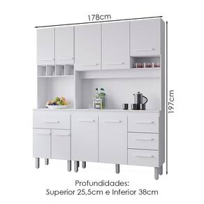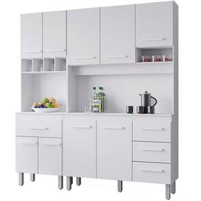 Kit Cozinha Vitória traz organização e praticidade para o seu dia a dia. Produzido em MDP (12/15 mm), com acabamento em pintura UV. Possui portas com dobradiças metálicas, gavetas com corrediças telescópicas, nichos decorativos funcionais e espaço ideal para microondas ou forno, além de puxadores e pés em plástico. Este produto será entregue em 03 volumes.