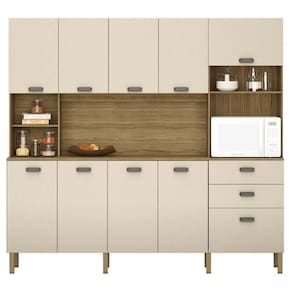 Com altura de 204,5 cm, largura de 222,2 cm e profundidade de 46,8 cm garantem que a cozinha Intense seja uma das maiores do mercado de Kits e cozinhas práticas. E o melhor: a instalação e a montagem são rápidas e fáceis, sem precisar furar a parede para fixação, o que faz toda a diferença para para você. Além disso, a cozinha prática Intense conta com 3 nichos decorativos que permitem personalizar a decoração da cozinha e guardar itens do dia a dia, deixando o ambiente ainda mais bonito e funcional. E não podemos esquecer do nicho para forno elétrico ou micro-ondas, com um espaço amplo para garantir a praticidade na hora de cozinhar e utilizar no dia a dia. Mas não é só isso. As duas amplas gavetas com corrediças telescópicas são um verdadeiro show à parte, proporcionando um deslize suave e sem esforço, sem contar que são super espaçosas e garantem a organização dos utensílios da cozinha.Os pés com regulagem, os puxadores em ABS com pintura inox e as portas em 15 mm de espessura garantem resistência e durabilidade, além de um design moderno e sofisticado.
