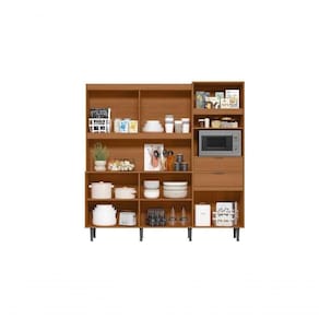 Este kit de cozinha é perfeito para quem busca praticidade e estilo, com acabamento em Jequitiba e amplo espaço de armazenamento.