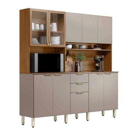 A Cozinha Compacta Amora da Demobile e composta por uma unica peca que dispoe de 10 portas e 2 gavetas para guardar panelas, mantimentos, talheres, loucas e decoracoes. Duas de suas portas sao em vidro e as suas duas gavetas com corredicas telescopicas e espaco para micro-ondas e um nicho para colocar seus utensilios de cozinha. Fabricado com uma estrutura em MDP, revestimento em pintura UV para melhor qualidade e durabilidade do produto. Seus pes possuem regulagem de altura se adequando as condicoes do chao. Alem de um design moderno encantador! Com este Kit Amora a sua cozinha vai ficar mais linda e aconchegante.