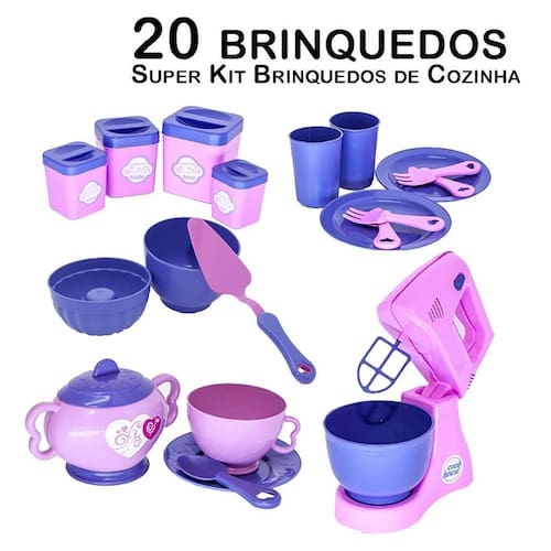 o kit vem com batedeira, forminha com acessório , xícara com pires e colher, açucareiro, pratos, copos, talheres, potinhos de mantimentos. ---------------------------------------------------------------------------------------------