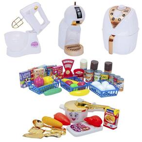 --------------------------------------------------------------------------------------------- - 1 caixinha de leite integral - 1 caixinha de biscoito cream cracker - 1 caixinha de bolacha de água e sal - 1 caixinha de sabão em pó - 1 caixinha de sucrilhos - 1 caixinha de balas de frutinhas - 1 pote de leite em pó - 1 pote de achocolatado - 1 pote de café - 1 latinha de ervilha - 1 latinha de milho - 1 latinha de molho - 1 latinha de refrigerante de guaraná - 1 latinha de refrigerante de laranja - 1 latinha de refrigerante de cola - 1 pimentão vermelho - 1 pimentão amarelo - 2 pepinos - 2 bananas - 2 maçãs - 1 limão - 4 ovos - 3 cestinhas - 1 balança com cestinho removível --------------------------------------------------------------------------------------------- - 1 panelinha de pressão 19 cm de comprimento, 9cm de largura, 10cm de altura com 3 talheres - 1 tábua - 4 comidinhas --------------------------------------------------------------------------------------------- - 1 air fryer de aproximadamente 13cm de altura x 9 cm de largura com gaveta removível