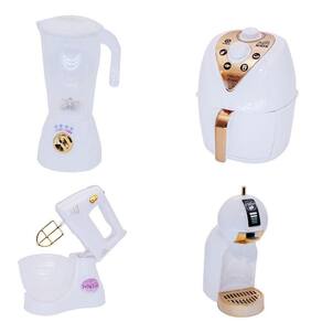 --------------------------------------------------------------------------------------------- - 1 caixinha de leite integral - 1 caixinha de biscoito cream cracker - 1 caixinha de bolacha de água e sal - 1 caixinha de sabão em pó - 1 caixinha de sucrilhos - 1 caixinha de balas de frutinhas - 1 pote de leite em pó - 1 pote de achocolatado - 1 pote de café - 1 latinha de ervilha - 1 latinha de milho - 1 latinha de molho - 1 latinha de refrigerante de guaraná - 1 latinha de refrigerante de laranja - 1 latinha de refrigerante de cola - 1 pimentão vermelho - 1 pimentão amarelo - 2 pepinos - 2 bananas - 2 maçãs - 1 limão - 4 ovos - 3 cestinhas - 1 balança com cestinho removível --------------------------------------------------------------------------------------------- - 1 panelinha de pressão 19 cm de comprimento, 9cm de largura, 10cm de altura com 3 talheres - 1 tábua - 4 comidinhas --------------------------------------------------------------------------------------------- - 1 air fryer de aproximadamente 13cm de altura x 9 cm de largura com gaveta removível