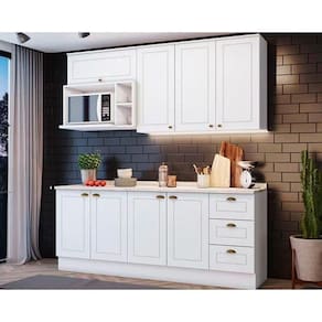 Cozinha Completa Americana 7 Peças (2 Aéreos + 2 Balcões + 1 Nicho + 2 Complementos ) CZ146 Branco - Henn Abaixo segue os produtos que compoem o KIT: - Tampo p/ Balcão Cozinha 80x53cm Calcare - Henn - 1 unidades Dimensões: Alt: 3cm x Larg80cm x Comp/Profund:80cm