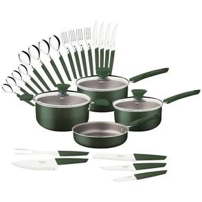 Composição: - 1 Caçarola 20cm 2,9L - 1 Panela 16cm 1,5L - 1 Panela 18cm 2,1L - 1 Frigideira Reta 20cm 1,4L - 4 Colheres de Mesa - 4 Colheres para Chá - 4 Facas de Mesa 4'' - 4 Garfos de Mesa - 1 Faca Chef 7'' - 1 Faca para Desossar 5'' - 1 Faca para Legumes 3'' - 1 Faca para Pão 7'' - 1 Garfo Trinchante