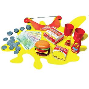 Contém:- 1 frigideira- 2 pratos- 2 copos- 1 colher- 1 garfo- 1 faca- 1 lata de refrigerante- 1 pão de hamburguer- 1 carne- 1 queijo- 1 alface- 1 tomate- 1 batata frita com caixa- 1 ketchup- 1 mostarda- 2 caixinhas de suco- 1 caixinha de hambúrguer- 1 viseira- 1 conjunto de notas- 1 conjunto de moedas Idade: acima de 3 anos