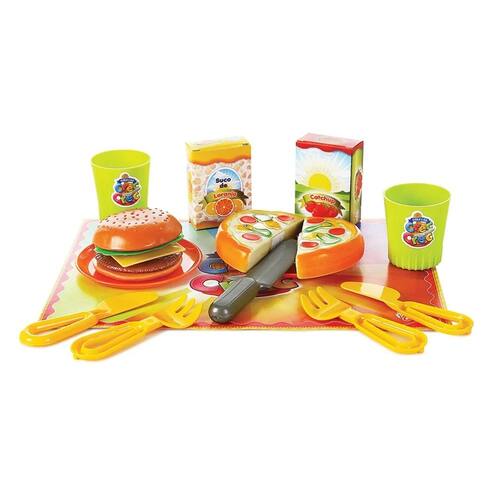 Pensado especialmente para trazer experiências do mundo real para o divertido mundo do faz de conta, este brinquedo possui 02 copos, 02 garfos, 02 caixinhas cartonadas, 02 toalhas cartonadas, 02 facas, 01 brotinho de pizza, 01 sanduíche, 02 pratos e 01 faca grande, tornando a brincadeira ainda mais real.