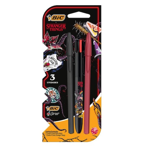Este kit inclui a icônica Caneta 4 Cores com corpo decorado com ícones de Stranger Things, dando um ar enigmático e cheio de personalidade para essa caneta tão icônica da BIC. Além disso, o kit conta com duas canetas esferográficas Cristal Efeito Matte exclusivas nas cores vermelha (tinta azul) e preta (tinta preta), proporcionando uma escrita suave e precisa. Uma delas possui escrita azul e a outra preta, garantindo funcionalidade e sofisticação em qualquer ocasião.