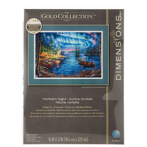 Dimensions Kit de ponto cruz contado Gold Collection, Noite do Norte, 16 unidades Dove Grey Aida, 40,6 cm x 28 cm, multicolorido, grande - O kit de ponto cruz avançado Northern Night inclui Aida cinza pomba, 16 unidades, fio de algodão pré-diverso, agulha e instruções fáceis. - O kit completo de ponto cruz Northern Lights mede 40 cm x 28 cm. - Este padrão avançado de ponto cruz apresenta uma vista deslumbrante da aurora boreal sobre um acampamento. - Projetado especificamente para costureiros experientes, este ponto cruz encantador usa pontos completos e meio para criar detalhes magníficos. - Enquadre e pendure seu ponto de cruz completo da Northern Lights para uma obra de arte de parede de tirar o fôlego.