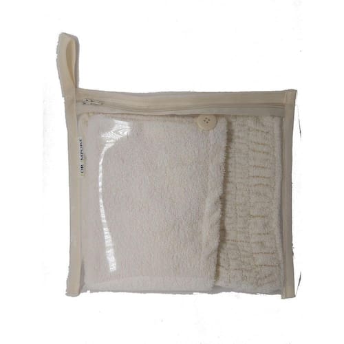 Kit cru, vem com turbante para secar o cabelo atoalhado cru, ele reduz pela metade o tempo de secagem do cabelo ao absorver a água e ajuda a diminuir o frizz, ótimo para segurar o cabelo e não deixar cair sobre o rosto ou roupa, já que conta com um fechamento em botão e faixa para cabelo tecido atoalhado, ajustável com elástico, tamanho único. Usada para proteger os cabelos durante a limpeza de pele, aplicação de maquiagem ou procedimentos faciais.