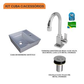 Sobre o ProdutoKit Cuba AQ33 C/Torneira Luxo 1195 + Válvula Click 1''B (2,6cm) AmareloDescrição do ProdutoO Kit KTCAAQ330W.AM.LC70.V02 é uma combinação perfeita da Cuba de Apoio CAAQ330W.AM com acessórios complementares, prontos para instalação no seu lavabo ou móvel de banheiro. Ele conta com 1 Cuba de Apoio Angular Quadrada Volcano 33X30cm Amarelo + 1 Torneira De Mesa Classic Luxo 1/4 De Volta 1195 C70 + 1 Válvula P/Lavatório Click Up Interno 1" (2,6cm) V02 Metal Cromado + 0+ 0+ 0 , todos compatíveis e prontos para instalação.Itens Inclusos:1 Cuba de Apoio + 1 Torneira de mesa baixa + 1 Válvula de Escoamento Clik Up Informações Logísticas:Vol.01 Comp.: 37,5cm Prof.: 37,5cm Alt.: 17cm Peso Bruto: 6,118Kg Observações:Não acompanha acessórios decorativos. Imagens meramente ilustrativas.Informações Técnicas / CaracterísticasCuba de Apoio Angular Quadrada Volcano 33X30cm Amarelo Cor: Amarelo Marca: Compace Modelo: CDQD330 Linha: Conect Formato: Angular Quadrada Tipo de Cuba: Apoio Material: Mármore Sintético Acabamento: Hard Lacca PU Escala de Brilho: Brilho Possui Ladrão: Não Possui Furação para Torneira: Sim Diâmetro do Furo para Torneira: (32mm) - DN 32 Diâmetro do Furo para Válvula: (40mm) - DN 40 Comprimento: 33cm Largura: 30cm Altura: 10cm Peso Líq.: 4,6Kg Recomendações de Uso, Manutenção e Limpeza: Utilize flanela seca ou pano macio, levemente umedecido com água. Evite contato com produtos químicos e abrasivos (solventes, thinner, acetona etc) e não utilize nenhum tipo de esponja de aço. Para maior brilho, recomendamos a utilização de cera automotiva n 2. Necessita de Montagem: Sim / Acompanha Manual de Montagem Complexidade da Montagem: Média: pode ser montado por mais de uma pessoa e/ou necessite de maior conhecimento para montagem. Garantia: 6 mesesTorneira De Mesa Classic Luxo 1/4 De Volta 1195 C70 Cor: Cromado Marca: Compace Modelo: CL1195 Linha: Classic Tipo de Torneira: Convencional Local: Lavatório Tipo de Instalação: De Mesa Acabamento: Camada de Cromo Salt Spray. Possui alta resistência contra corrosão, maresia, oxidação e descascamento. Material: Liga de Cobre (Bronze e Latão), Inox, Zamac, Elastômeros e Plásticos de Engenharia Possui Arejador Sim Tipo de Bica: Móvel Pressão Máxima: 40 m.c.a. Pressão Mínima: 2 m.c.a. Temperatura da Água Indicada: Mín.: 5 Celsius / Máx.: 70 Celsius Bitola do Cano: 1/2" Altura Total: 23cm Altura da base até a saída da água: 15cm Profundidade da saída da água até o final do cano: 14cm Peso Líq.: 0,48Kg Recomendações de Uso, Manutenção e Limpeza: Limpar apenas com pano macio e sabão neutro. Não usar produtos abrasivos como sapólio, palha de aço e produtos químicos. Garantia: 5 anosVálvula P/Lavatório Click Up Interno 1" (2,6cm) V02 Metal Cromado Cor: Cromado Marca: Compace Modelo: CO1612V02 Linha: Complementos Tipo: Click Local: Lavatório Acabamento: Cromado Material: Zamak, Elastômeros e Plásticos de Engenharia. Bitola do Cano: 1" Possui Ladrão: Não Altura: 7cm Diâmetro: 5,5cm Altura Total: 8cm Peso Líq.: 0,11Kg Recomendações de Uso, Manutenção e Limpeza: Limpar apenas com pano macio e sabão neutro. Não usar produtos abrasivos como sapólio, palha de aço e produtos químicos. Necessita de Montagem: Sim Complexidade da Montagem: Média: pode ser montado por mais de uma pessoa e/ou necessite de maior conhecimento para montagem. Garantia: 5 anos