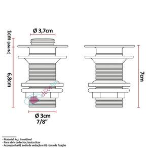 Modelo da válvula: Click Material da válvula: Aço Inoxidável Medidas da válvula: Altura aberta: 8 cm Altura fechada: 7 cm Diâmetro total: 5,5 cm Diâmetro da rosca: 3 cm - 7/8"