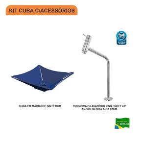 Sobre o ProdutoKit Cuba L34 C/Torneira Link 1062 Metal 1/4 Volta AmareloDescrição do ProdutoO Kit KTCALX340W.AM.1062 é uma combinação perfeita da Cuba de Apoio CALX340W.AM com acessórios complementares, prontos para instalação no seu lavabo ou móvel de banheiro. Ele conta com 1 Cuba de Apoio Folha L34 34,5X34,5cm Amarelo + 1 Torneira P/Lavatório Pratika 45 1/4 Volta Bica Alta 36cm Metal Cromado + 0+ 0+ 0+ 0 , todos compatíveis e prontos para instalação.Itens Inclusos:1 Cuba de Apoio + 1 Torneira de mesa alta Informações Logísticas:Vol.01 - Comp.: 40cm - Prof.: 40cm - Alt.: 15,5cm - Peso Bruto: 3,67Kg Observações:Não acompanha acessórios decorativos. Imagens meramente ilustrativas.Informações Técnicas / CaracterísticasCuba de Apoio Folha L34 34,5X34,5cm Amarelo- Cor: Amarelo- Marca: Compace- Modelo: CALX340- Linha: Lux- Formato: Folha- Tipo de Cuba: Apoio- Material: Mármore Sintético- Acabamento: Hard Lacca PU- Escala de Brilho: Brilho- Possui Ladrão: Não- Possui Furação para Torneira: Não - Diâmetro do Furo para Válvula: (40mm) - DN 40 - Comprimento: 34,5cm- Largura: 34,5cm- Altura: 11,5cm - Peso Líq.: 2,88Kg- Recomendações de Uso, Manutenção e Limpeza: Utilize flanela seca ou pano macio, levemente umedecido com água. Evite contato com produtos químicos e abrasivos (solventes, thinner, acetona etc) e não utilize nenhum tipo de esponja de aço. Para maior brilho, recomendamos a utilização de cera automotiva n 2.- Necessita de Montagem: Sim / Acompanha Manual de Montagem- Complexidade da Montagem: Média: pode ser montado por mais de uma pessoa e/ou necessite de maior conhecimento para montagem.- Garantia: 6 mesesTorneira P/Lavatório Pratika 45 1/4 Volta Bica Alta 36cm Metal Cromado- Cor: Cromado- Marca: Compace- Modelo: 1062- Linha: Pratika- Tipo de Torneira: Convencional- Local: Lavatório- Tipo de Instalação: De Mesa- Acabamento: Camada de Cromo Salt Spray. Possui alta resistência contra corrosão, maresia, oxidação e descascamento.- Material: Liga de Cobre (Bronze e Latão), Inox, Zamac, Elastômeros e Plásticos de Engenharia- Possui Arejador Sim- Tipo de Bica: Fixa- Pressão Máxima: 40 m.c.a.- Pressão Mínima: 2 m.c.a.- Temperatura da Água Indicada: Mín.: 5 Celsius / Máx.: 70 Celsius- Bitola do Cano: 1/2 - Altura Total: 36cm- Altura da base até a saída da água: 28cm- Profundidade da saída da água até o final do cano: 14cm- Peso Líq.: 0,35Kg- Recomendações de Uso, Manutenção e Limpeza: Limpar apenas com pano macio e sabão neutro. Não usar produtos abrasivos como sapólio, palha de aço e produtos químicos.- Garantia: 5 anos Formato: Folha | Tipo de Cuba: Apoio | Material: Mármore Sintético | Acabamento: Hard Lacca PU Fosco | Escala de Brilho: Fosco | Possui Furação para Torneira: Não | Diâmetro do Furo para Torneira: 0 | Diâmetro do Furo para Válvula: (40mm) - DN 40 | Itens Inclusos: 1 Cuba de Apoio + 1 Torneira de mesa alta | Limite de unidades por venda: É possível comprar até 1 unidade por venda. | Quantidade máxima de pedido: 1 | Baterias são necessárias?: false Cor: Azul Escuro