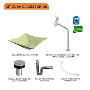 Sobre o ProdutoKit Cuba L34 C/Torneira Link 1062 Metal + Válvula Click 1''B (2,6cm) + Sifão Cromado + Flexível AmareloDescrição do ProdutoO Kit KTCALX340W.AM.1062.AC02 é uma combinação perfeita da Cuba de Apoio CALX340W.AM com acessórios complementares, prontos para instalação no seu lavabo ou móvel de banheiro. Ele conta com 1 Cuba de Apoio Folha L34 34,5X34,5cm Amarelo + 1 Torneira P/Lavatório Pratika 45 1/4 Volta Bica Alta 36cm Metal Cromado + 1 Válvula P/Lavatório Click Up Interno 1 (2,6cm) V02 Metal Cromado + 1 Sifão Pvc Universal Cromado + 1 Engate Flexível Pvc Branco 40cm + 0 , todos compatíveis e prontos para instalação.Itens Inclusos:1 Cuba de Apoio + 1 Torneira de mesa alta + 1 Válvula de Escoamento Clik Up + 1 Sifão PVC Universal Cromado + 1 Engate Flexível 40cm Informações Logísticas:Vol.01 - Comp.: 40cm - Prof.: 40cm - Alt.: 15,5cm - Peso Bruto: 3,99Kg Observações:Não acompanha acessórios decorativos. Imagens meramente ilustrativas.Informações Técnicas / CaracterísticasCuba de Apoio Folha L34 34,5X34,5cm Amarelo- Cor: Amarelo- Marca: Compace- Modelo: CALX340- Linha: Lux- Formato: Folha- Tipo de Cuba: Apoio- Material: Mármore Sintético- Acabamento: Hard Lacca PU- Escala de Brilho: Brilho- Possui Ladrão: Não- Possui Furação para Torneira: Não - Diâmetro do Furo para Válvula: (40mm) - DN 40 - Comprimento: 34,5cm- Largura: 34,5cm- Altura: 11,5cm - Peso Líq.: 2,88Kg- Recomendações de Uso, Manutenção e Limpeza: Utilize flanela seca ou pano macio, levemente umedecido com água. Evite contato com produtos químicos e abrasivos (solventes, thinner, acetona etc) e não utilize nenhum tipo de esponja de aço. Para maior brilho, recomendamos a utilização de cera automotiva n 2.- Necessita de Montagem: Sim / Acompanha Manual de Montagem- Complexidade da Montagem: Média: pode ser montado por mais de uma pessoa e/ou necessite de maior conhecimento para montagem.- Garantia: 6 mesesTorneira P/Lavatório Pratika 45 1/4 Volta Bica Alta 36cm Metal Cromado- Cor: Cromado- Marca: Compace- Modelo: 1062- Linha: Pratika- Tipo de Torneira: Convencional- Local: Lavatório- Tipo de Instalação: De Mesa- Acabamento: Camada de Cromo Salt Spray. Possui alta resistência contra corrosão, maresia, oxidação e descascamento.- Material: Liga de Cobre (Bronze e Latão), Inox, Zamac, Elastômeros e Plásticos de Engenharia- Possui Arejador Sim- Tipo de Bica: Fixa- Pressão Máxima: 40 m.c.a.- Pressão Mínima: 2 m.c.a.- Temperatura da Água Indicada: Mín.: 5 Celsius / Máx.: 70 Celsius- Bitola do Cano: 1/2 - Altura Total: 36cm- Altura da base até a saída da água: 28cm- Profundidade da saída da água até o final do cano: 14cm- Peso Líq.: 0,35Kg- Recomendações de Uso, Manutenção e Limpeza: Limpar apenas com pano macio e sabão neutro. Não usar produtos abrasivos como sapólio, palha de aço e produtos químicos.- Garantia: 5 anosVálvula P/Lavatório Click Up Interno 1 (2,6cm) V02 Metal Cromado- Cor: Cromado- Marca: Compace- Modelo: CO1612V02- Linha: Complementos- Tipo: Click- Local: Lavatório- Acabamento: Cromado- Material: Zamak, Elastômeros e Plásticos de Engenharia.- Bitola do Cano: 1- Possui Ladrão: Não - Altura: 7cm- Diâmetro: 5,5cm - Altura Total: 8cm- Peso Líq.: 0,14Kg- Recomendações de Uso, Manutenção e Limpeza: Limpar apenas com pano macio e sabão neutro. Não usar produtos abrasivos como sapólio, palha de aço e produtos químicos.- Necessita de Montagem: Sim- Complexidade da Montagem: Média: pode ser montado por mais de uma pessoa e/ou necessite de maior conhecimento para montagem.- Garantia: 5 anosSifão Pvc Universal Cromado- Cor: Cromado- Marca: Compace- Modelo: SCRO- Linha: Complementos- Tipo: Flexível- Local: Multiuso- Acabamento: Cromado- Material: PVC- Bitola do Cano: Universal - Temperatura da Água Indicada: Mín.: 0 Celsius / Máx.: 90 Celsius - Comprimento: 29cm - Diâmetro: 5cm- Comprimento Total: 71cm - Peso Líq.: 0,1Kg- Recomendações de Uso, Manutenção e Limpeza: Limpar apenas com pano macio e sabão neutro. Não usar produtos abrasivos como sapólio, palha de aço e produtos químicos.- Necessita de Montagem: Sim- Complexidade da Montagem: Média: pode ser montado por mais de uma pessoa e/ou necessite de maior conhecimento para montagem.- Garantia: 01 anoEngate Flexível Pvc Branco 40cm- Cor: Branco- Marca: Compace- Modelo: FLEX- Linha: Complementos- Tipo: Flexível- Local: Multiuso- Acabamento: PVC- Material: PVC- Bitola do Cano: Universal - Pressão Indicada: 40 m.c.a.- Temperatura da Água Indicada: Fria - Comprimento: 40cm - Diâmetro: 2cm - Peso Líq.: 0,08Kg- Recomendações de Uso, Manutenção e Limpeza: Limpar apenas com pano macio e sabão neutro. Não usar produtos abrasivos como sapólio, palha de aço e produtos químicos.- Necessita de Montagem: Sim- Complexidade da Montagem: Média: pode ser montado por mais de uma pessoa e/ou necessite de maior conhecimento para montagem.- Garantia: 01 ano Formato: Folha | Tipo de Cuba: Apoio | Material: Mármore Sintético | Acabamento: Hard Lacca PU Fosco | Escala de Brilho: Fosco | Possui Furação para Torneira: Não | Diâmetro do Furo para Torneira: 0 | Diâmetro do Furo para Válvula: (40mm) - DN 40 | Itens Inclusos: 1 Cuba de Apoio + 1 Torneira de mesa alta + 1 Válvula de Escoamento Clik Up + 1 Sifão PVC Universal Cromado + 1 Engate Flexível 40cm | Limite de unidades por venda: É possível comprar até 1 unidade por venda. | Quantidade máxima de pedido: 1 | Baterias são necessárias?: false Cor: Verde Acqua