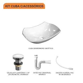 Sobre o ProdutoKit Cuba L42 C/Válvula Click 1 1/2'' (4,0cm) + Sifão Pvc + Flexível BrancaDescrição do ProdutoO Kit KTCALX420W.BR.AP04 é uma combinação perfeita da Cuba de Apoio CALX420W.BR com acessórios complementares, prontos para instalação no seu lavabo ou móvel de banheiro. Ele conta com 1 Cuba de Apoio Abaulada L42 44,5X31cm Branca + 1 Válvula P/Lavatório / Tanque Click Up 1 1/2" (04cm) V04 Metal Cromado + 1 Sifão Pvc Universal Branco + 1 Engate Flexível Pvc Branco 40cm + 0+ 0 , todos compatíveis e prontos para instalação.Itens Inclusos:1 Cuba de Apoio + 1 Válvula de Escoamento Clik Up + 1 Sifão PVC Universal Branco + 1 Engate Flexível 40cm Informações Logísticas:Vol.01 Comp.: 46,5cm Prof.: 33,5cm Alt.: 17cm Peso Bruto: 5,9Kg Observações:Não acompanha acessórios decorativos. Imagens meramente ilustrativas.Informações Técnicas / CaracterísticasCuba de Apoio Abaulada L42 44,5X31cm Branca Cor: Branca Marca: Compace Modelo: CALX420 Linha: Lux Formato: Abaulada Tipo de Cuba: Apoio Material: Mármore Sintético Acabamento: Hard Lacca PU Escala de Brilho: Brilho Possui Ladrão: Não Possui Furação para Torneira: Não Diâmetro do Furo para Válvula: (40mm) - DN 40 Comprimento: 44,5cm Largura: 31cm Altura: 14,5cm Peso Líq.: 4,7Kg Recomendações de Uso, Manutenção e Limpeza: Utilize flanela seca ou pano macio, levemente umedecido com água. Evite contato com produtos químicos e abrasivos (solventes, thinner, acetona etc) e não utilize nenhum tipo de esponja de aço. Para maior brilho, recomendamos a utilização de cera automotiva n 2. Necessita de Montagem: Sim / Acompanha Manual de Montagem Complexidade da Montagem: Média: pode ser montado por mais de uma pessoa e/ou necessite de maior conhecimento para montagem. Garantia: 6 mesesVálvula P/Lavatório / Tanque Click Up 1 1/2" (04cm) V04 Metal Cromado Cor: Cromado Marca: Compace Modelo: CO1615V04 Linha: Complementos Tipo: Click Local: Lavatório Acabamento: Cromado Material: Zamak, Elastômeros e Plásticos de Engenharia. Bitola do Cano: 1.1/2 (40mm) - DN 40 Possui Ladrão: Não Altura: 9cm Diâmetro: 6,5cm Altura Total: 9cm Peso Líq.: 0,2Kg Recomendações de Uso, Manutenção e Limpeza: Limpar apenas com pano macio e sabão neutro. Não usar produtos abrasivos como sapólio, palha de aço e produtos químicos. Necessita de Montagem: Sim Complexidade da Montagem: Média: pode ser montado por mais de uma pessoa e/ou necessite de maior conhecimento para montagem. Garantia: 5 anosSifão Pvc Universal Branco Cor: Branco Marca: Compace Modelo: SPVC Linha: Complementos Tipo: Flexível Local: Multiuso Acabamento: PVC Material: PVC Bitola do Cano: Universal Temperatura da Água Indicada: Mín.: 0 Celsius / Máx.: 90 Celsius Comprimento: 29cm Diâmetro: 5cm Comprimento Total: 71cm Peso Líq.: 0,1Kg Recomendações de Uso, Manutenção e Limpeza: Limpar apenas com pano macio e sabão neutro. Não usar produtos abrasivos como sapólio, palha de aço e produtos químicos. Necessita de Montagem: Sim Complexidade da Montagem: Média: pode ser montado por mais de uma pessoa e/ou necessite de maior conhecimento para montagem. Garantia: 01 anoEngate Flexível Pvc Branco 40cm Cor: Branco Marca: Compace Modelo: FLEX Linha: Complementos Tipo: Flexível Local: Multiuso Acabamento: PVC Material: PVC Bitola do Cano: Universal Pressão Indicada: 40 m.c.a. Temperatura da Água Indicada: Fria Comprimento: 40cm Diâmetro: 2cm Peso Líq.: 0,08Kg Recomendações de Uso, Manutenção e Limpeza: Limpar apenas com pano macio e sabão neutro. Não usar produtos abrasivos como sapólio, palha de aço e produtos químicos. Necessita de Montagem: Sim Complexidade da Montagem: Média: pode ser montado por mais de uma pessoa e/ou necessite de maior conhecimento para montagem. Garantia: 01 ano