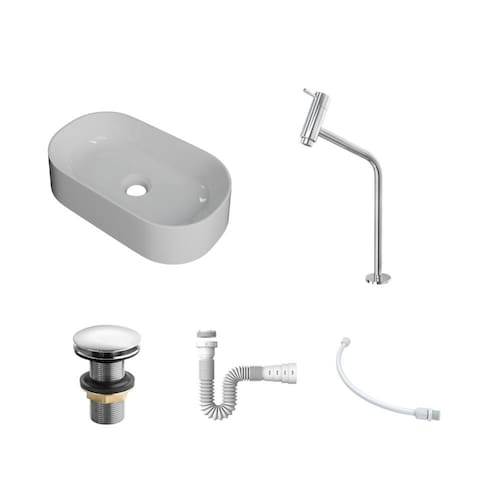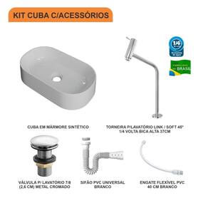 Sobre o ProdutoKit Cuba OV42 C/Torneira Link 1062 Metal + Válvula Click 1''G + Sifão Pvc + Flexível BrancaDescrição do ProdutoO Kit KTCAOV420W.BR.1062.AP03 é uma combinação perfeita da Cuba de Apoio CAOV420W.BR com acessórios complementares, prontos para instalação no seu lavabo ou móvel de banheiro. Ele conta com 1 Cuba de Apoio Oval Laila 42,9X25,2cm Branca + 1 Torneira P/Lavatório Pratika 45 1/4 Volta Bica Alta 36cm Metal Cromado + 1 Válvula P/Lavatório Click Up 1" (2,6cm) V03 Metal Cromado + 1 Sifão Pvc Universal Branco + 1 Engate Flexível Pvc Branco 40cm + 0 , todos compatíveis e prontos para instalação.Itens Inclusos:1 Cuba de Apoio + 1 Torneira de mesa alta + 1 Válvula de Escoamento Clik Up + 1 Sifão PVC Universal Branco + 1 Engate Flexível 40cm Informações Logísticas:Vol.01 Comp.: 46,5cm Prof.: 30cm Alt.: 16cm Peso Bruto: 4,816Kg Observações:Não acompanha acessórios decorativos. Imagens meramente ilustrativas.Informações Técnicas / CaracterísticasCuba de Apoio Oval Laila 42,9X25,2cm Branca Cor: Branca Marca: Compace Modelo: CAOV420 Linha: Conect Formato: Oval Tipo de Cuba: Apoio Material: Mármore Sintético Acabamento: Hard Lacca PU Escala de Brilho: Brilho Possui Ladrão: Não Possui Furação para Torneira: Não Diâmetro do Furo para Válvula: (40mm) - DN 40 Comprimento: 42,9cm Largura: 25,2cm Altura: 10,5cm Peso Líq.: 3,6Kg Recomendações de Uso, Manutenção e Limpeza: Utilize flanela seca ou pano macio, levemente umedecido com água. Evite contato com produtos químicos e abrasivos (solventes, thinner, acetona etc) e não utilize nenhum tipo de esponja de aço. Para maior brilho, recomendamos a utilização de cera automotiva n 2. Necessita de Montagem: Sim / Acompanha Manual de Montagem Complexidade da Montagem: Média: pode ser montado por mais de uma pessoa e/ou necessite de maior conhecimento para montagem. Garantia: 6 mesesTorneira P/Lavatório Pratika 45 1/4 Volta Bica Alta 36cm Metal Cromado Cor: Cromado Marca: Compace Modelo: 1062 Linha: Pratika Tipo de Torneira: Convencional Local: Lavatório Tipo de Instalação: De Mesa Acabamento: Camada de Cromo Salt Spray. Possui alta resistência contra corrosão, maresia, oxidação e descascamento. Material: Liga de Cobre (Bronze e Latão), Inox, Zamac, Elastômeros e Plásticos de Engenharia Possui Arejador Sim Tipo de Bica: Fixa Pressão Máxima: 40 m.c.a. Pressão Mínima: 2 m.c.a. Temperatura da Água Indicada: Mín.: 5 Celsius / Máx.: 70 Celsius Bitola do Cano: 1/2" Altura Total: 36cm Altura da base até a saída da água: 28cm Profundidade da saída da água até o final do cano: 14cm Peso Líq.: 0,3Kg Recomendações de Uso, Manutenção e Limpeza: Limpar apenas com pano macio e sabão neutro. Não usar produtos abrasivos como sapólio, palha de aço e produtos químicos. Garantia: 5 anosVálvula P/Lavatório Click Up 1" (2,6cm) V03 Metal Cromado Cor: Cromado Marca: Compace Modelo: CO1613V03 Linha: Complementos Tipo: Click Local: Lavatório Acabamento: Cromado Material: Zamak, Elastômeros e Plásticos de Engenharia. Bitola do Cano: 1" Possui Ladrão: Não Altura: 8cm Diâmetro: 5,7cm Altura Total: 9cm Peso Líq.: 0,15Kg Recomendações de Uso, Manutenção e Limpeza: Limpar apenas com pano macio e sabão neutro. Não usar produtos abrasivos como sapólio, palha de aço e produtos químicos. Necessita de Montagem: Sim Complexidade da Montagem: Média: pode ser montado por mais de uma pessoa e/ou necessite de maior conhecimento para montagem. Garantia: 5 anosSifão Pvc Universal Branco Cor: Branco Marca: Compace Modelo: SPVC Linha: Complementos Tipo: Flexível Local: Multiuso Acabamento: PVC Material: PVC Bitola do Cano: Universal Temperatura da Água Indicada: Mín.: 0 Celsius / Máx.: 90 Celsius Comprimento: 29cm Diâmetro: 5cm Comprimento Total: 71cm Peso Líq.: 0,1Kg Recomendações de Uso, Manutenção e Limpeza: Limpar apenas com pano macio e sabão neutro. Não usar produtos abrasivos como sapólio, palha de aço e produtos químicos. Necessita de Montagem: Sim Complexidade da Montagem: Média: pode ser montado por mais de uma pessoa e/ou necessite de maior conhecimento para montagem. Garantia: 01 anoEngate Flexível Pvc Branco 40cm Cor: Branco Marca: Compace Modelo: FLEX Linha: Complementos Tipo: Flexível Local: Multiuso Acabamento: PVC Material: PVC Bitola do Cano: Universal Pressão Indicada: 40 m.c.a. Temperatura da Água Indicada: Fria Comprimento: 40cm Diâmetro: 2cm Peso Líq.: 0,08Kg Recomendações de Uso, Manutenção e Limpeza: Limpar apenas com pano macio e sabão neutro. Não usar produtos abrasivos como sapólio, palha de aço e produtos químicos. Necessita de Montagem: Sim Complexidade da Montagem: Média: pode ser montado por mais de uma pessoa e/ou necessite de maior conhecimento para montagem. Garantia: 01 ano