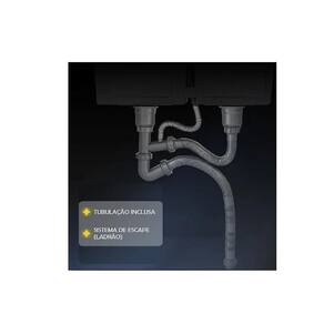 Itens inclusos Torneira monocomando extensível Mangueira flexível de aço trançado 50cm para ligação de água quente e fria Sistema de fixação Anéis de vedação Cuba dupla projetada para aplicação sobreposta ou embutida. Dosador de sabão de 300ml com sistema recarrega fácil. Não é necessário retirar o reservatório para reabastecê-lo. Cesto escorredor ajustável Válvula 4 1 2 totalmente compatíveis com o uso de trituradores elétricos . Válvula e tubulação do ladrão Sifão