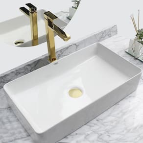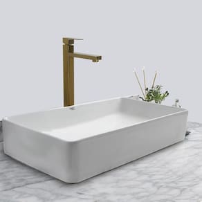 Kit Cuba Pia Louça Cerâmica Banheiro Com Torn E Vál Dourada 1 Decore seu banheiro com este kit de sobrepor contendo cuba, torneira e válvula que não é apenas uma tendência no mundo do desenho, mas também lhe dará espaço suficiente em seus lados para colocar itens de higiene pessoal.