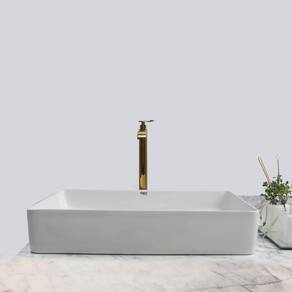 Kit Cuba Pia Louça Cerâmica Banheiro Com Torn E Vál Dourada 2 Decore seu banheiro com este kit de sobrepor contendo cuba, torneira e válvula que não é apenas uma tendência no mundo do desenho, mas também lhe dará espaço suficiente em seus lados para colocar itens de higiene pessoal.
