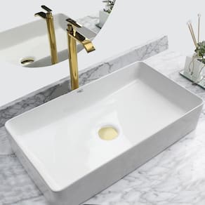 Kit Cuba Pia Louça Cerâmica Banheiro Com Torn E Vál Dourada 2 Decore seu banheiro com este kit de sobrepor contendo cuba, torneira e válvula que não é apenas uma tendência no mundo do desenho, mas também lhe dará espaço suficiente em seus lados para colocar itens de higiene pessoal.