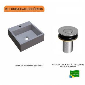 O Kit KTCAQD395W.CL.V02 é uma combinação perfeita da Cuba de Apoio CAQD395W.CL com acessórios complementares, prontos para instalação no seu lavabo ou móvel de banheiro. Ele conta com 1 Cuba de Apoio Quadrada Veneza 39X37cm Colorida, 1 Válvula para Lavatório Click Up Interno 1" (2,6cm) V02 Metal Cromado, todos compatíveis e prontos para instalação. Acompanha Flexível: Não Acompanha Manual de Instalação: Sim Acompanha Sifão: Não Acompanha Torneira: Não Altura: 11,5 cm Comprimento: 39 cm Cor: Cinza Cor do Produto: Cinza Diâmetro do furo: 32 mm Diâmetro para válvula: 40 mm Itens Inclusos: 1 Cuba de Apoio, 1 Válvula de Escoamento Click Up e Manual de Instalação Largura: 37 cm Linha ou Coleção: Conect Manual de Montagem e Instalação: https://product-hub-prd.madeiramadeira.com.br/611622/documents/78d75f19-93dd-4815-a14d-0fcc39b14e88ualkitcubasemtorneiraclv02.pdf Material Principal: Mármore Sintético Origem do Produto: Nacional Peso: 7,84 kg Possui furação para torneira: Sim Possui ladrão: Não Recomendações de Uso, Manutenção e Limpeza: Utilize flanela seca ou pano macio, levemente umedecido com água. Evite contato com produtos químicos e abrasivos (solventes, thinner, acetona etc) e não utilize nenhum tipo de esponja de aço. Para maior brilho, recomendamos a utilização de cera automotiva n° 2. Válvula oculta: Não Ean: 7909903436042