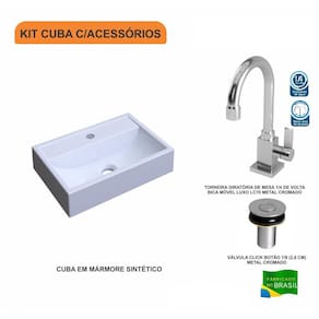 O Kit KTCAQD450W.BR.LC70.V02 é uma combinação perfeita da Cuba de Apoio CAQD450W.BR com acessórios complementares, prontos para instalação no seu lavabo ou móvel de banheiro. Ele conta com 1 Cuba de Apoio Retangular Q45 44,5X30,5cm Branca 1 Torneira De Mesa Classic Luxo 1/4 De Volta 1195 C70 1 Válvula P/Lavatório Click Up Interno 1" (2,6cm) V02 Metal Cromado, todos compatíveis e prontos para instalação. Acompanha Manual de Instalação: Sim Acompanha Sifão: Não Acompanha Torneira: Sim Altura: 10 cm Altura da Torneira: 23 cm Comprimento: 44 cm Cor: Branca Cor do Produto: Branca Diâmetro do furo: 40 mm Diâmetro para válvula: 40 mm Informações Complementares: Sobre o ProdutoKit Cuba Q45 C/Torneira Luxo 1195 + Válvula Click 1''B (2,6cm) BrancaDescrição do ProdutoO Kit KTCAQD450W.BR.LC70.V02 é uma combinação perfeita da Cuba de Apoio CAQD450W.BR com acessórios complementares, prontos para instalação no seu lavab Itens Inclusos: 1 Cuba de Apoio , 1 Torneira de mesa baixa , 1 Válvula de Escoamento Clik Up Largura: 30 cm Linha ou Coleção: Conect Manual de Montagem e Instalação: https://cdn2.madeiramadeira.com.br/atributo/compace/631069-ktcaqd45w0cllc70v02.rar Material da Torneira: Latão Material Principal: Mármore Sintético Origem do Produto: Nacional Peso: 5 kg Possui furação para torneira: Sim Possui ladrão: Não Pressão Máxima da Torneira: 40 mca Pressão Mínima da Torneira: 2 mca Recomendações de Uso, Manutenção e Limpeza: Utilize flanela seca ou pano macio, levemente umedecido com água. Evite contato com produtos químicos e abrasivos (solventes, thinner, acetona etc) e não utilize nenhum tipo de esponja de aço. Para maior brilho, recomendamos a utilização de cera automotiva n° 2. Tipo de Acionamento da Torneira: 1/4 de volta Válvula oculta: Não Ean: 7908388143537
